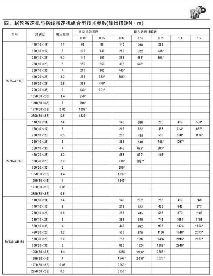 蝸輪減速機與擺線減速機組合型技術(shù)參數(shù)表(輸出扭矩N.M)二